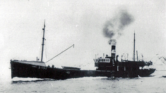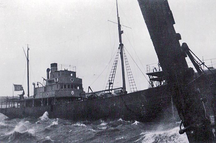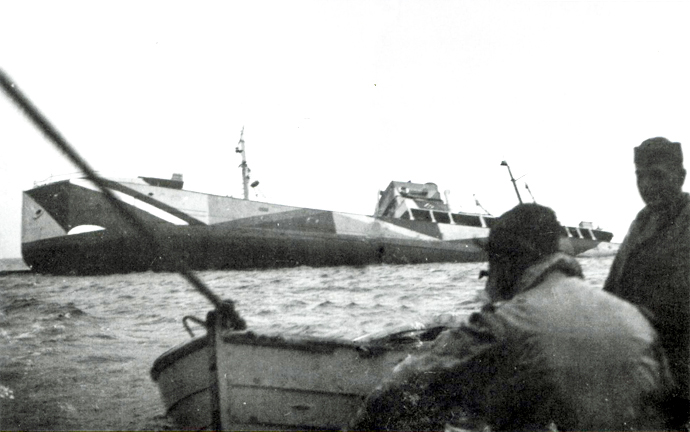 I tysk teneste under siste krig fekk «Pioner I» namnet «Rätier» og gjekk inn i hamneflotiljen i Molde. Her ser vi båten under ein storm jula 1941. (Foto: Kurt Reichmuth).