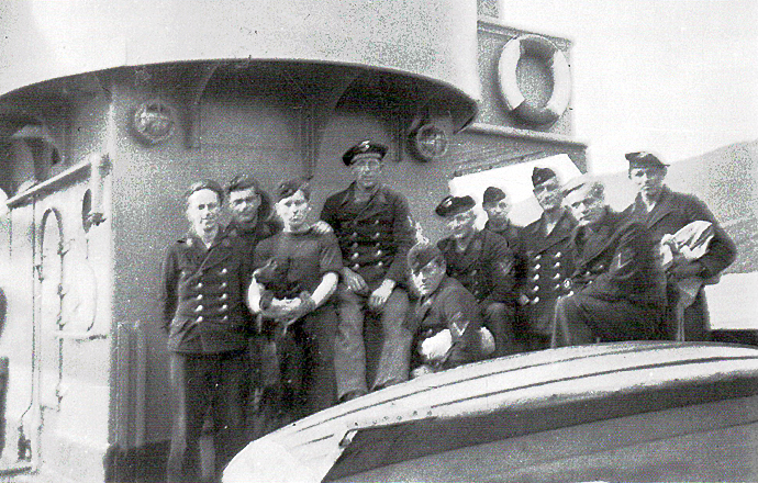 Mannskap frå «Rätier», som forliste på Hustadvika under krigen, om bord i «Teutone», som var namnet på «Ullasund» i tysk teneste. (Foto: Kurt Reichmuth).