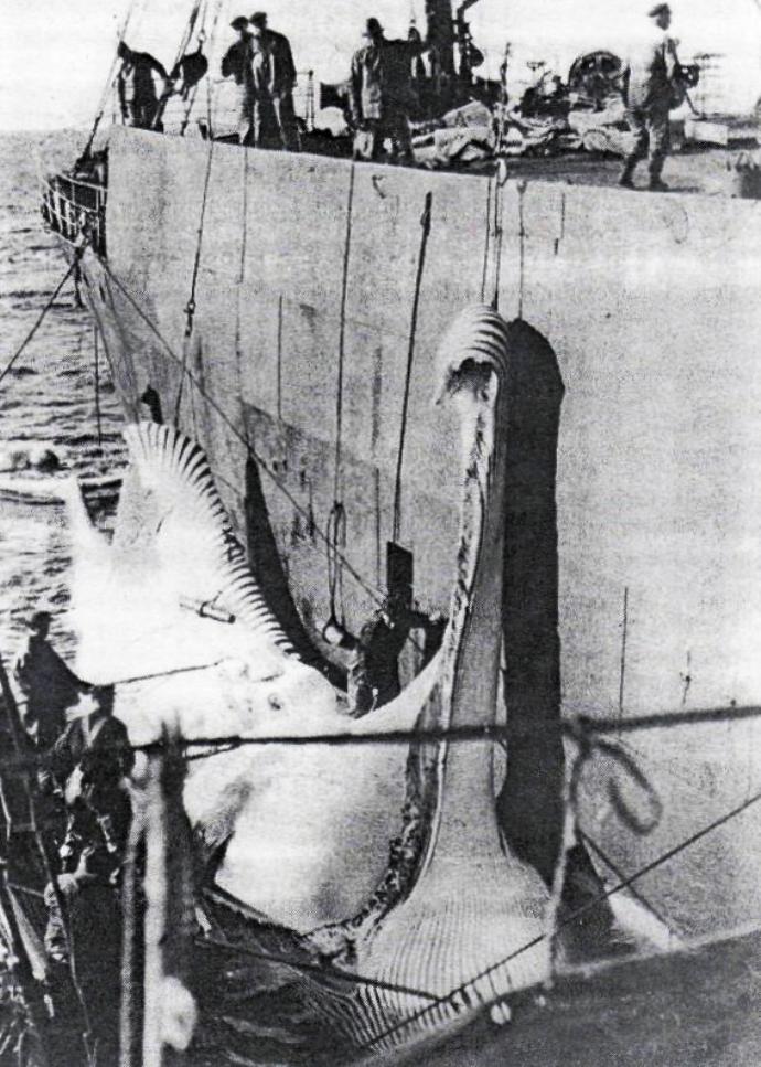 Flensing av hval i åpen sjø var ofte en hasardiøs og livsfarlig jobb. På dette unike foto fra feltet ved Bjørnøya i 1930 ser vi karene fra «PIONER» i aksjon.