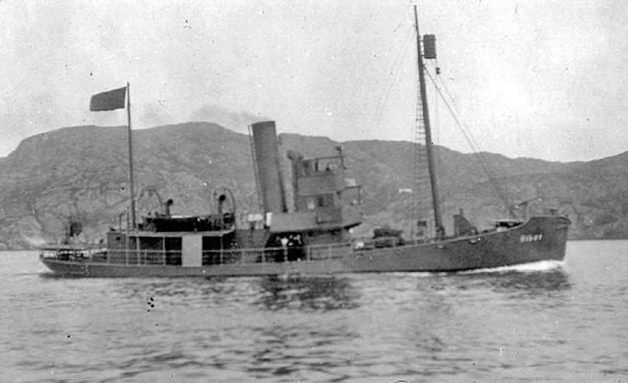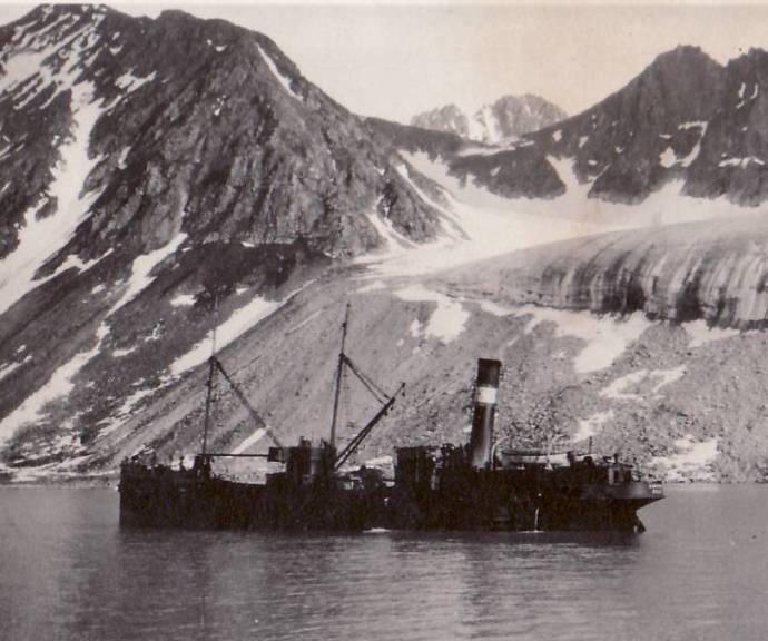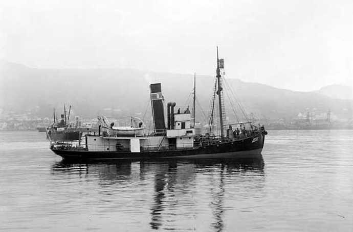 Hvalbåten «SIR SAMUEL SCOTT» kommer inn til Pioner med fangst. Båten var bygd ved Kaldnes Mek. Verksted i Tønsberg i 1908. Under første verdenskrig var den rekvirert av Den Norske Marine som patruljebåt. «SIR SAMUEL SCOTT» ble hugget opp i 1935. Bildet er tatt ved Bjørnøya i 1930.
