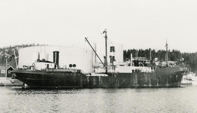 Hvalkokeriet «PIONER» ved kai i Fagerstrand utenfor Oslo. Bildet er tatt våren 1930 og viser fartøyet like før det legger ut på sitt første tokt til Norskehavet.